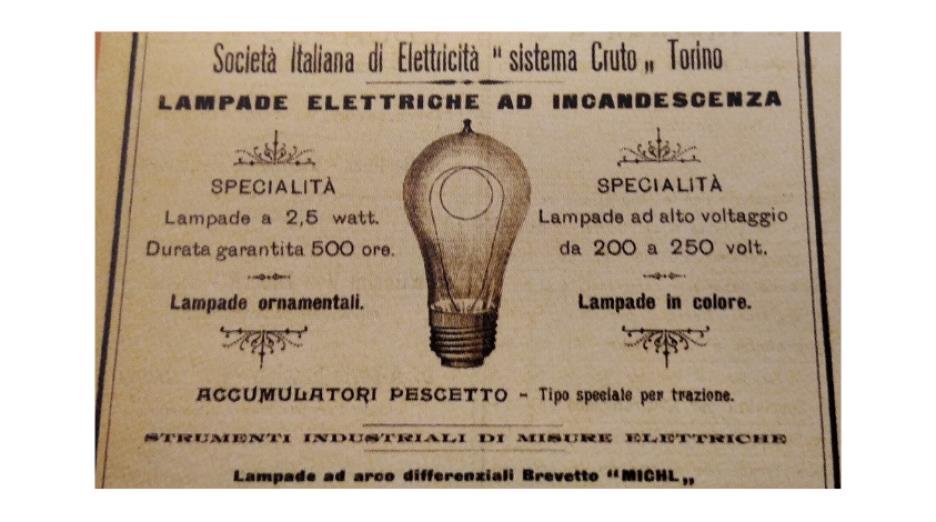 Alessandro Cruto è noto in tutto il mondo per avere enormemente migliorato la costruzione e quindi la durata delle lampadine ad incandescenza: l’opificio nasce per la produzione su larga scala di tali lampadine.