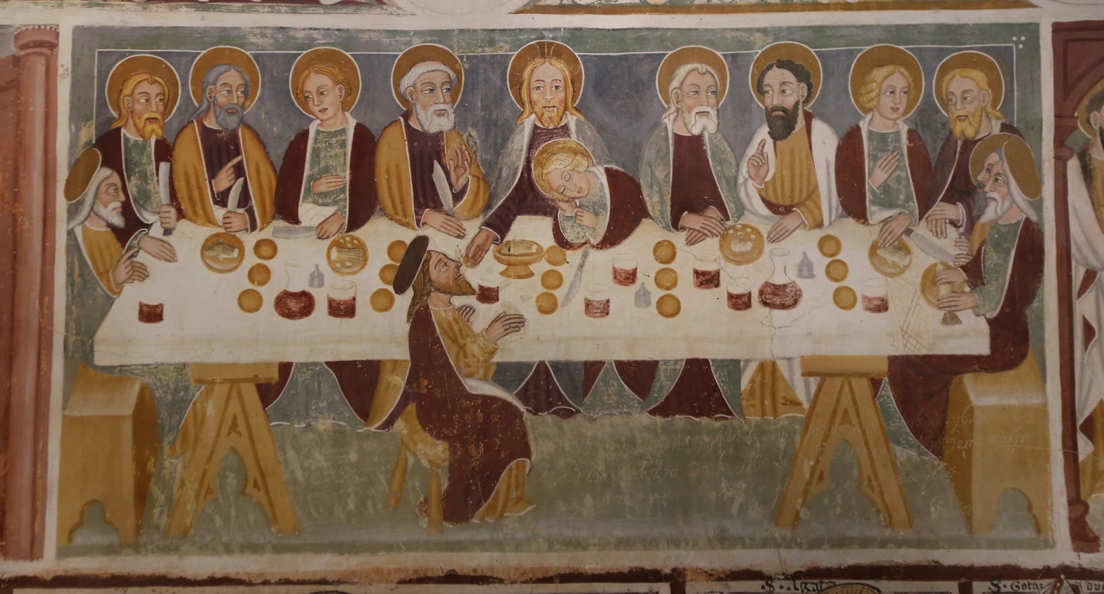 Particolari curiosi si trovano nell’Ultima Cena, vedi scheda, dove si vede Giuda sul davanti della tavola e con l’aureola scura; all’estrema destra si notano due visi contigui, che probabilmente derivano da un ripensamento, e che portano a tredici il numero degli Apostoli.