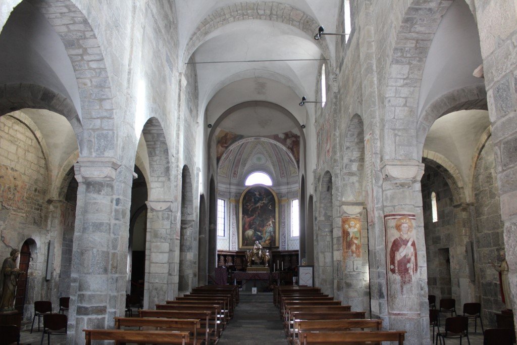 L’interno della chiesa, in stile romanico fino all’altare, è diviso in 3 navate con poderosi pilastri e presenza di capitelli medioevali con scolpite immagini di animali.