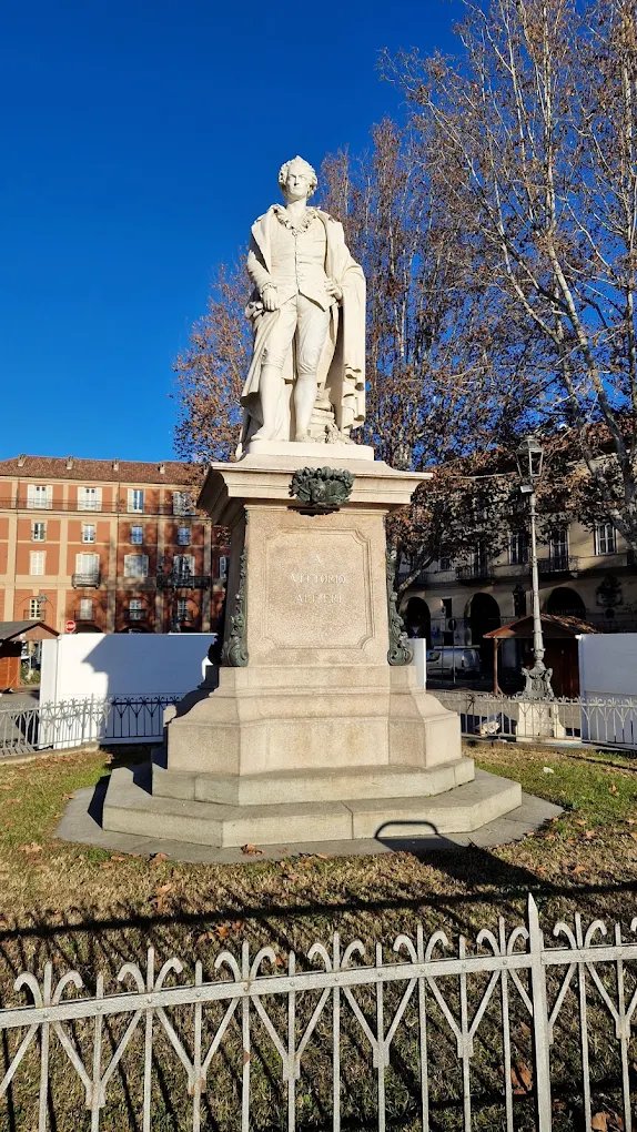 Dedicato al drammaturgo, poeta e scrittore nativo di Asti, la statua di Vittorio Alfieri è in marmo e il monumento è in granito.