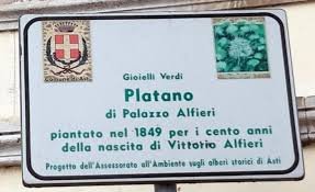 Possente platano comune piantato nel 1849 per i cento anni dalla nascita di Vittorio Alfieri (1749 – 1803) nella Piazza Cairoli.
