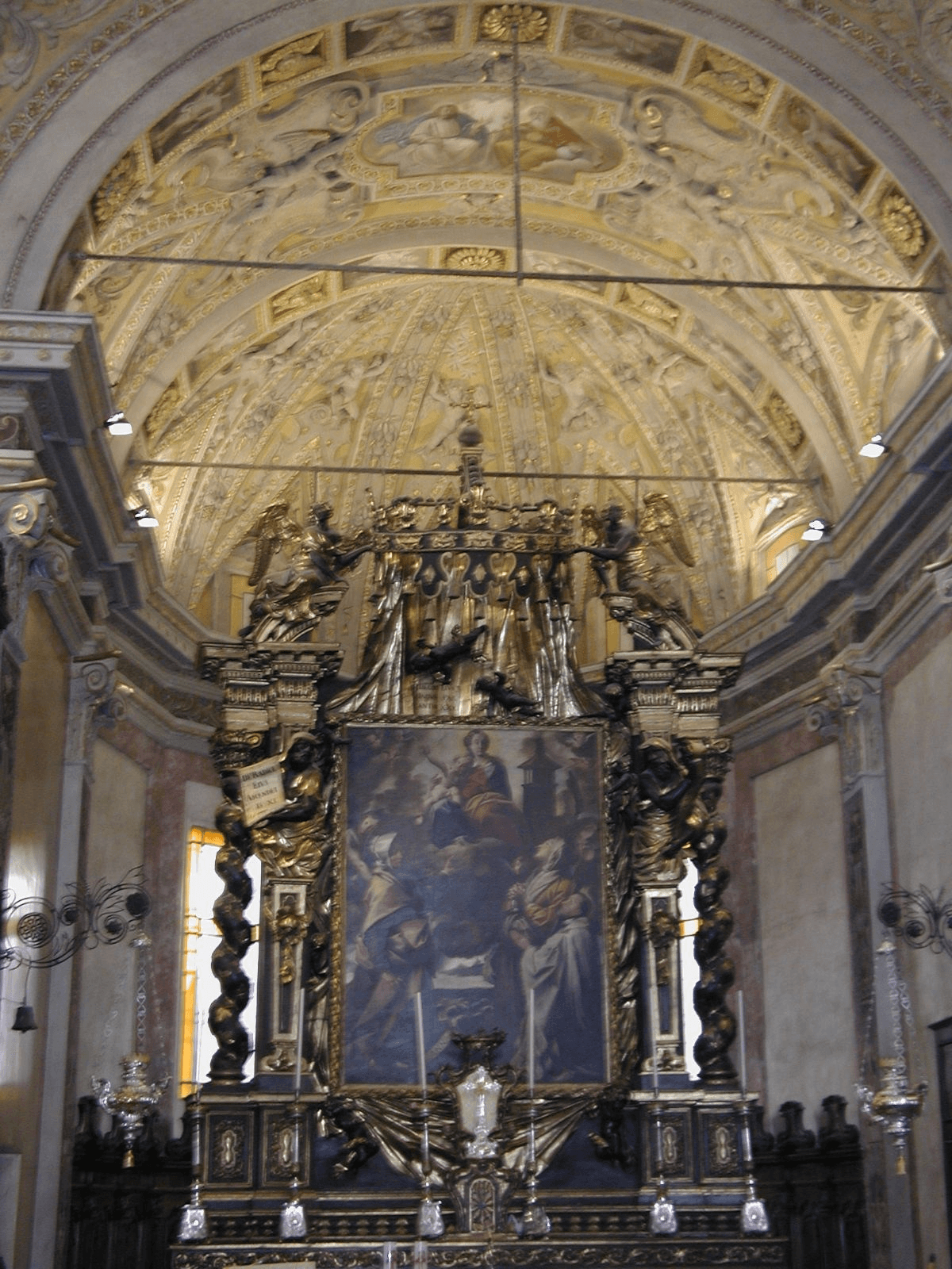 E’ chiaro qui come Bartolomeo Vandoni si nutra della lezione del Morazzone appresa in terra oleggese creando, in questa tela, una delle sue composizioni più originali e vive: bello il ritratto del Bovio con la cotta descritta nei minimi dettagli che resta il passo più realistico rispetto agli stereotipi morazzoniani delle sante e della Vergine. Le figure, che come una cortina aprono al paesaggio in tempesta, accompagnano lo sguardo verso l’apparizione della Vergine col Bambino portati in volo con la Santa Casa di Loreto da un festante coro angelico.