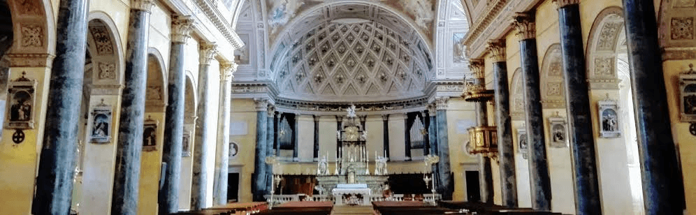La volta, con struttura a botte a cassettoni, è decorata con elementi floreali e un ciclo pittorico che rappresenta scene vetero e neotestamentarie, ad opera di Rodolfo Gambini .