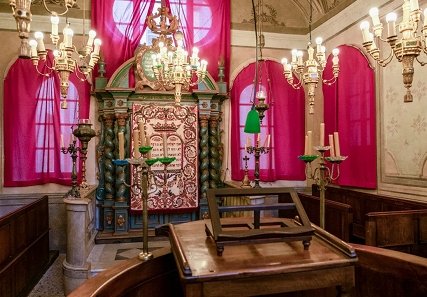 (1) – Arón (Arón ha-Kodesh) : “Armadio sacro”. È l’armadio posto sulla parete orientale della sinagoga, volta verso Gerusalemme. Vi sono custoditi i rotoli della Torà (3), rivestiti dei loro ornamenti.