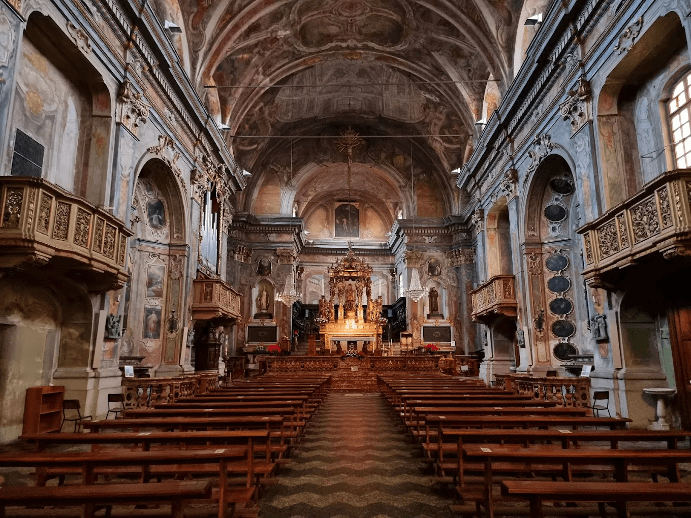 All’interno vi sono molte opere di notevole importanza. L’altare maggiore è di Antonio Pini fu realizzato nel 1680 ed è costituito da tre scomparti: l’inferiore con due bellissimi angeli; quello centrale con figure a tutto tondo; quello superiore che celebra la Trinità. Inoltre vi si possono vedere le opere del Morazzone: San Carlo Borromeo in gloria (1616) e Processione del santo Chiodo (1616), SS. Trinità (1620), San Rocco e gli appestati (1612 – 1615); Martirio di San Fortunato (1844) di Michele Cusa; Martirio di san Bartolomeo (metà del secolo XVIII) di Antonio Tosi detto il Cuzzio.