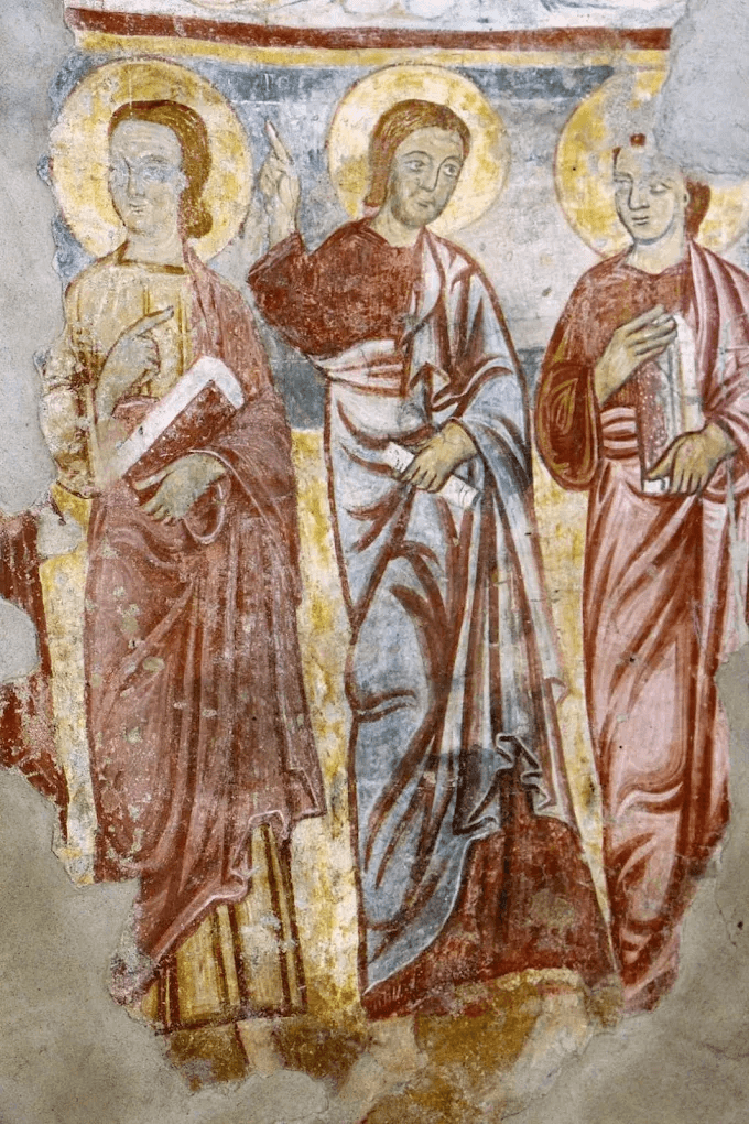 Le campate sono decorate con scene bibliche come l’Ultima Cena e figure di santi e sante. Sono presenti anche affreschi più tardi, tra cui la Madonna dei sette dolori.