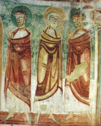 Il tamburo dell’abside presenta una fascia affrescata, con la rappresentazione della Vergine circondata da otto Apostoli che rivela influssi bizantini nell’atteggiamento e nei panneggi; invece gli Apostoli hanno una chiara impronta della scuola legata a modelli ottoniani transalpini. La diversità di stile tra la Madonna e gli Apostoli non significa che abbiano lavorato due artisti: potrebbe essere un solo pittore che ha voluto caratterizzare in maniera differente due parti dell’opera.