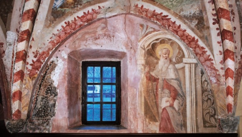 Gli affreschi Secenteschi, sulla parete destra del sacello, raffigurano sant’Antonio abate e a sinistra sant’Isidoro in preghiera; sulla volta quattro episodi evangelici – Gesù nell’Orto del Getsemani, la Flagellazione, La Salita al Calvario, La Risurrezione – resi dall’ignoto pittore con pennellate efficaci, rapide, fluide e colorate con discreto vigore che rivelano una cultura ancora tardo manierista.