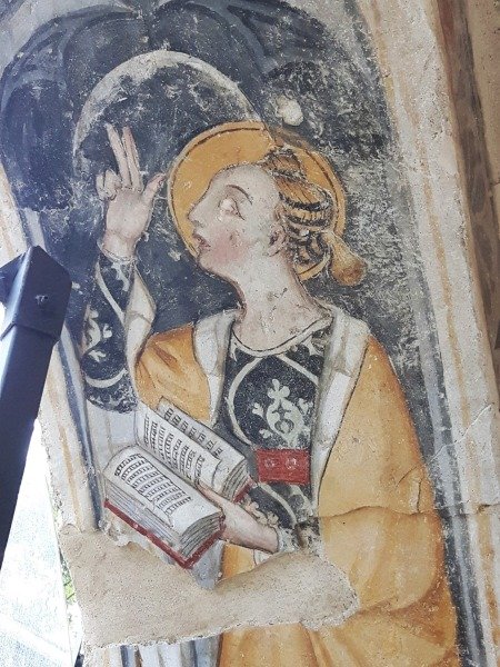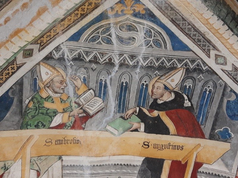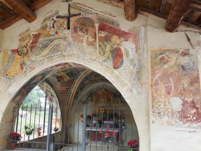 Nel XVII secolo venne aggiunto il porticato, sotto cui spiccano un’Annunciazione, San Bernardo da Mentone, fondatore degli Ospizi del Grande e Piccolo San Bernardo e protettore dei viaggiatori e dei montanari, Santa Caterina d’Alessandria col simbolo del martirio, la ruota dentata simbolo di Valgrana.