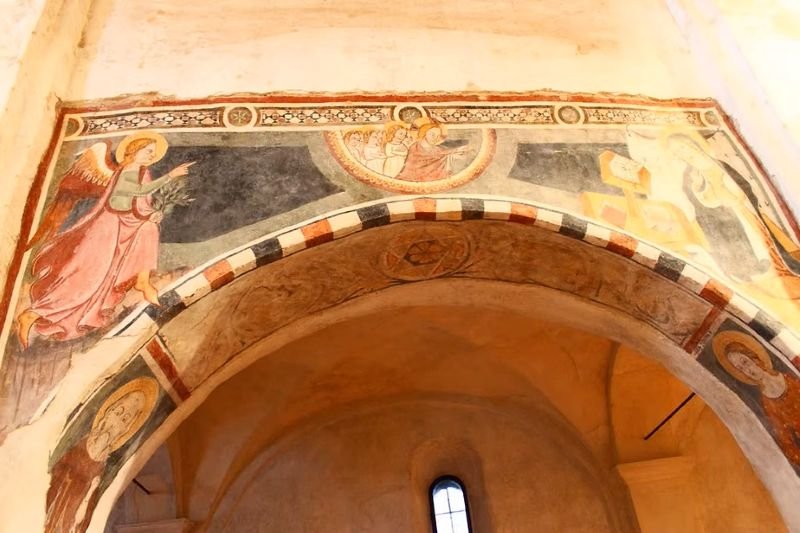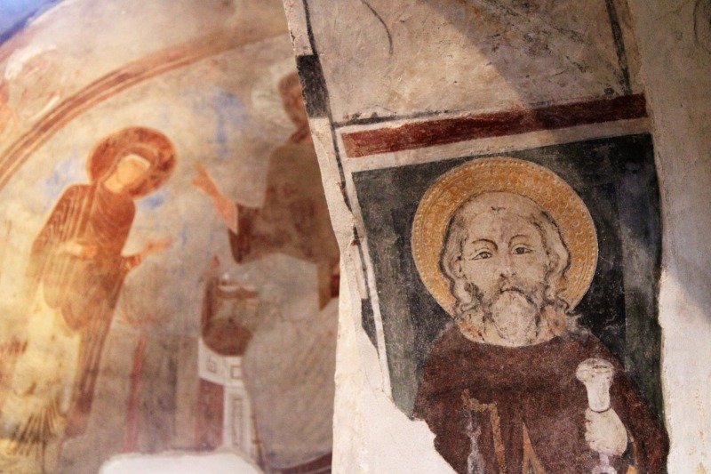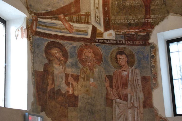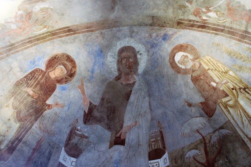 L’abside centrale fu decorata verso la metà del XII secolo da un notevole ciclo di affreschi, rappresentante nel catino il Cristo in trono affiancato dall’apostolo Pietro (che gli restituisce alla fine dei tempi le chiavi della Chiesa) e da una figura femminile che personifica la Chiesa come madre.