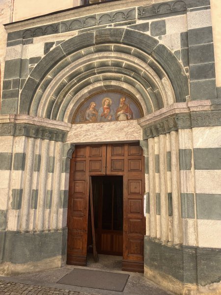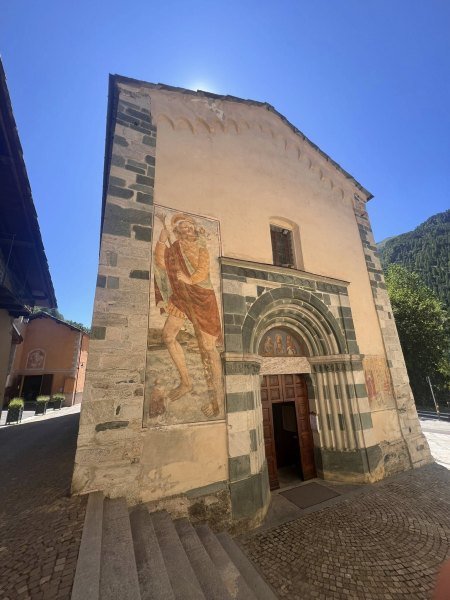 La facciata principale è caratterizzata dal portale in conci di marmo bianco e della locale pietra verde, lavorato a scalpellino con decorazioni simboliche; presenta anche affreschi del XV secolo.