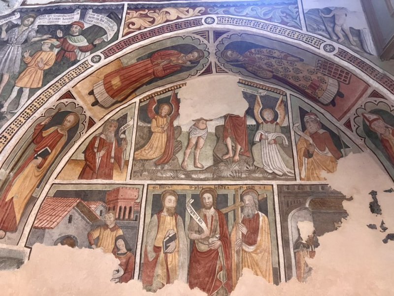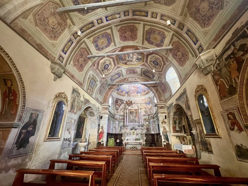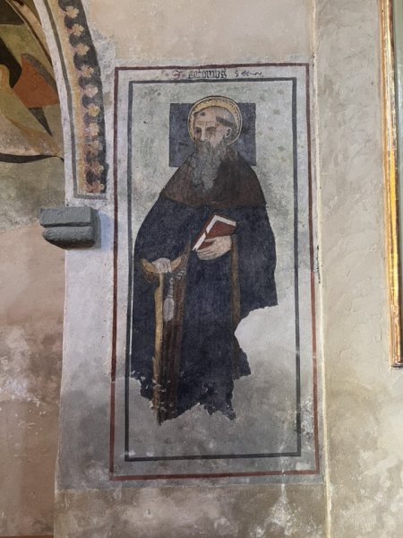 L’abside, a pianta quadrata, di dimensioni minori rispetto alla navata, accoglieva l’altar maggiore addossato alla parete di fondo. Su questa si stendevano degli affreschi (sec. XV), parte del più ampio ciclo pittorico che occupava tutta la navata, dei quali non conosciamo il soggetto ma la cui presenza è ancora testimoniata nel 1636. Tra le figure di santi affrescate, compare sulla parete sinistra anche un sant’Antonio abate, nella consueta iconografia: con saio e mantello nero, bastone a stampella cui è appeso un campanello; nella mano sinistra un libro rosso chiuso.
