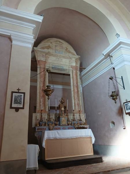 Nel giardino si trova la cappella, disposta su due livelli, restaurata a cura della famiglia Ricardi, in cui è posta una mostra di altare in tela dipinta a “trompe l’oeil”, unico esempio di «architettura effimera» in Canavese e nel Piemonte settentrionale, ideata e fatta realizzare da Amedeo di Castellamonte.
