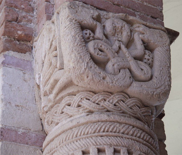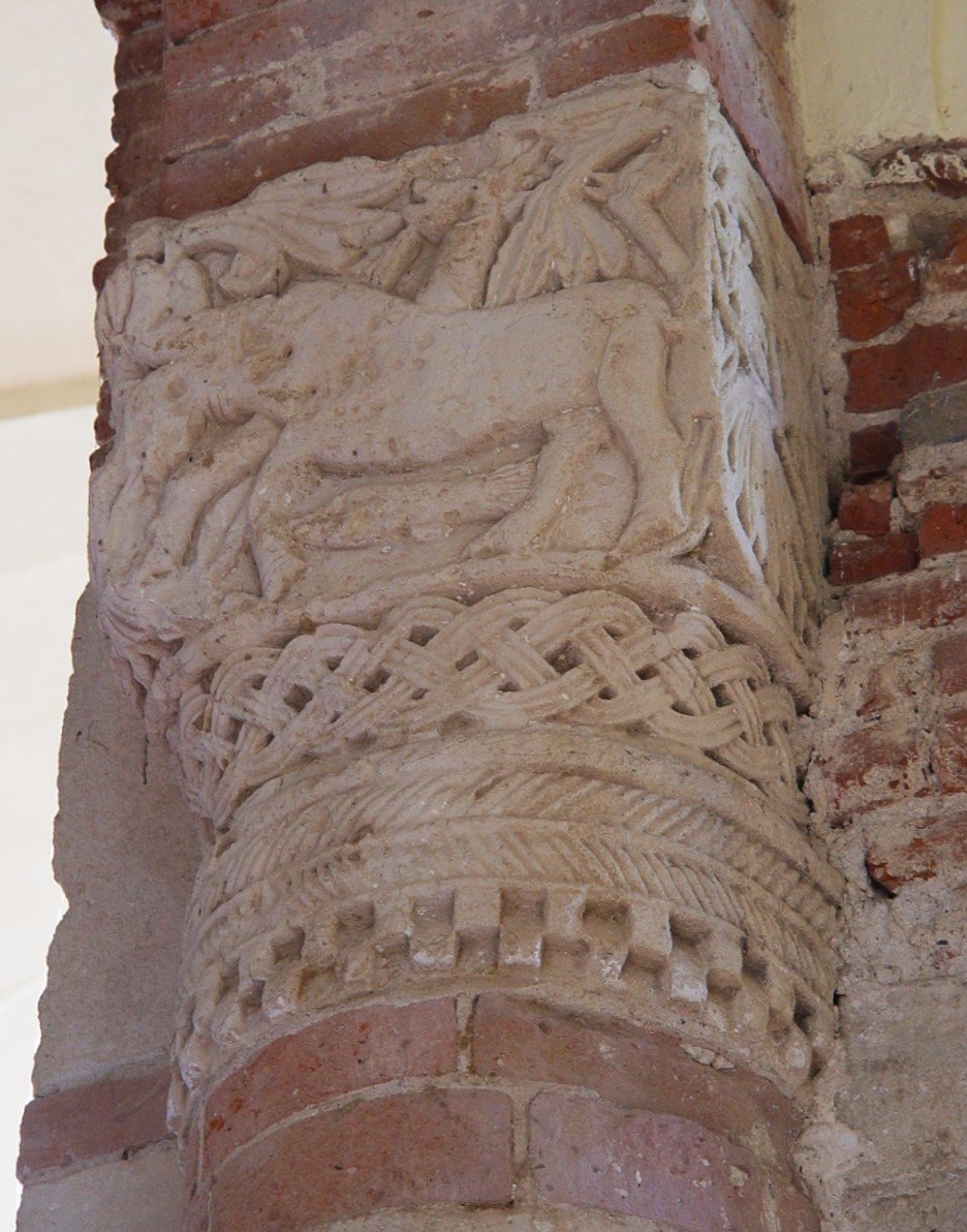 L’interno della chiesa ha conservato meglio le caratteristiche romaniche con tre navate e copertura a capriata. I pilastri sono a sezione quadrata con addossate semicolonne e lesene e i capitelli, molto allungati rispetto al diametro, sono scolpiti con intrecci di animali, vegetali, mostri e sirene.