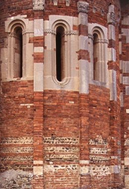 La parte esterna a est mostra elementi di muro con reimpiego di mattoni romani e tratti in pietrame a spina di pesce.