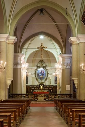 Pianta a tre navate con nicchie ad arco a tutto sesto contenenti altari o quadri votivi; ha pareti intonacate e un bel pulpito in legno.