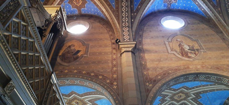 La chiesa presenta una decorazione con campiture monocrome e decori geometrici ripetitivi e dipinti figurativi pertinenti all’intervento di manutenzione straordinaria dei primi del ‘900.