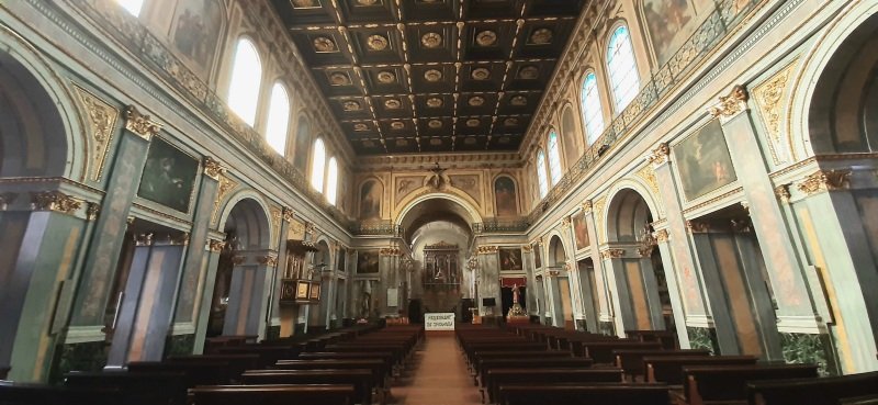 Entrati all’interno della Chiesa colpisce la vista il prezioso soffitto di legno ornato con grandi e piccoli rosoni dorati, opera del celebre falegname Rosso Filippo.