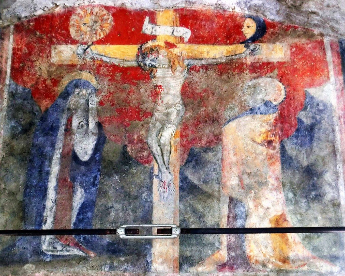Conserva all’interno nel lato absidale affreschi del ‘400, attribuibili forse alla scuola di Giacomo Pitterio, comunque di raffinata fattura. Si distinguono sul registro superiore una Crocefissione con il Sole e la Luna, Maria e Giovanni, a sinistra Santa Caterina con la ruota del martirio, a destra Santa Margherita che esce dal ventre del Drago. Nel registro inferiore a sinistra San Bartolomeo con la propria pelle scuoiata, al centro San Sebastiano trafitto dalle frecce, a destra Sant’Antonio abate con sotto il porcellino nero.