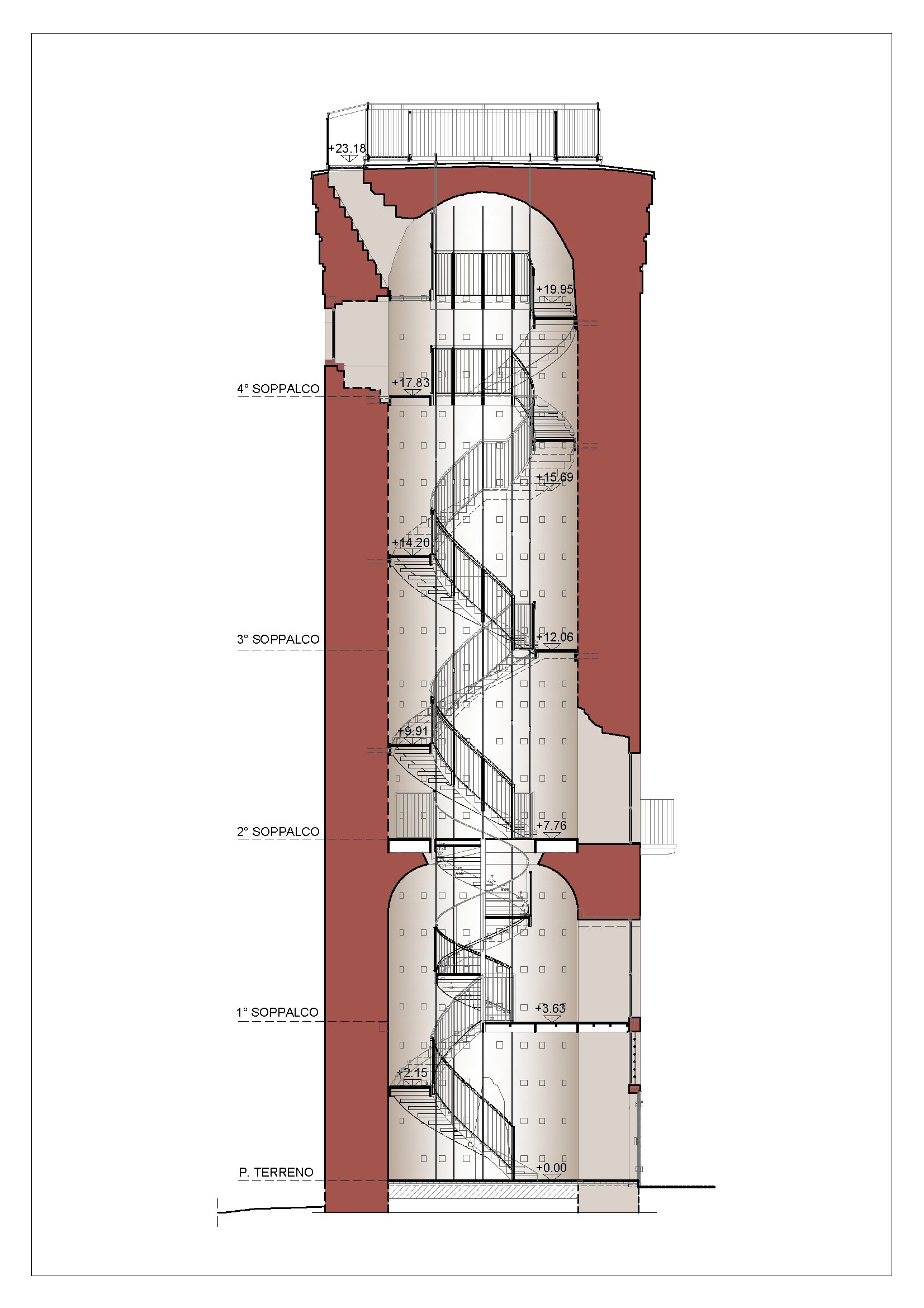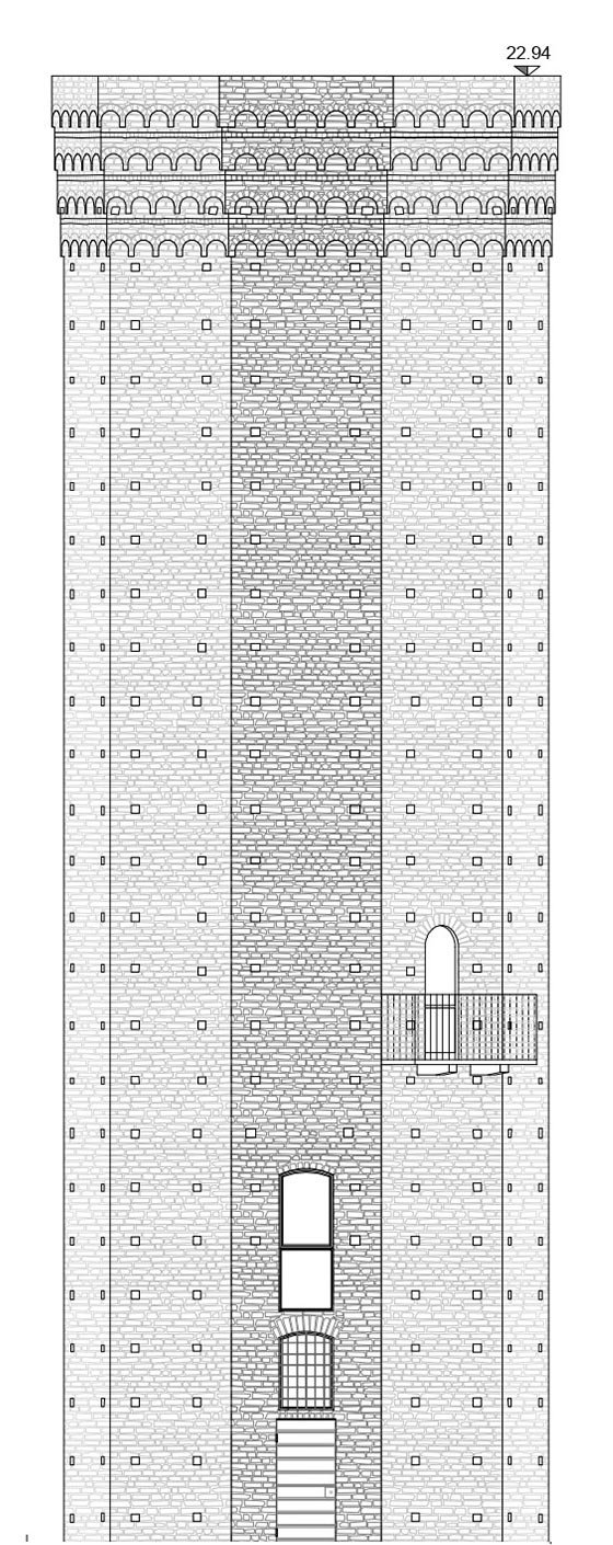 La torre decagonale, larga 7.20 m, è alta circa 22.94 m ed è ora conclusa da una copertura piana portata dalla sottostante cupola in muratura che chiude in alto il vano circolare interno. Inferiormente l’impianto murario, spesso mediamente 1,45 m, è ancora irrobustito da una seconda cupola, aperta al centro, che portava un impalcato ora crollato.