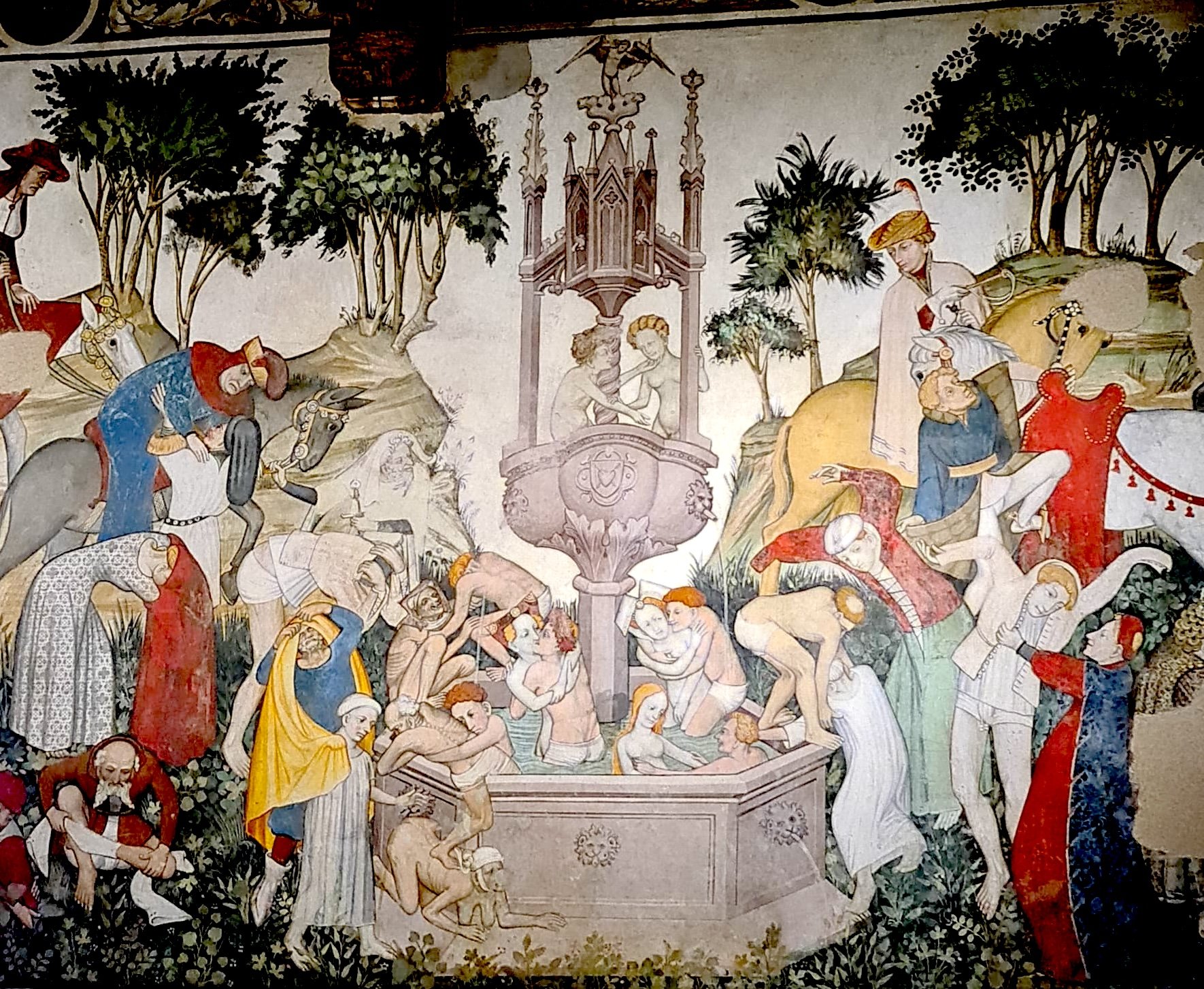 Il ciclo di affreschi celebra temi di grande valore culturale, come la “Fontana della Giovinezza”, ispirata al “Roman de Fauvel”, e la rappresentazione di “Nove Prodi e Nove Eroine”, che esaltano l’eroismo e il valore militare. Questi temi, simbolici e propagandistici, erano tipici di un periodo in cui le immagini venivano usate per trasmettere valori morali e legittimare il potere.