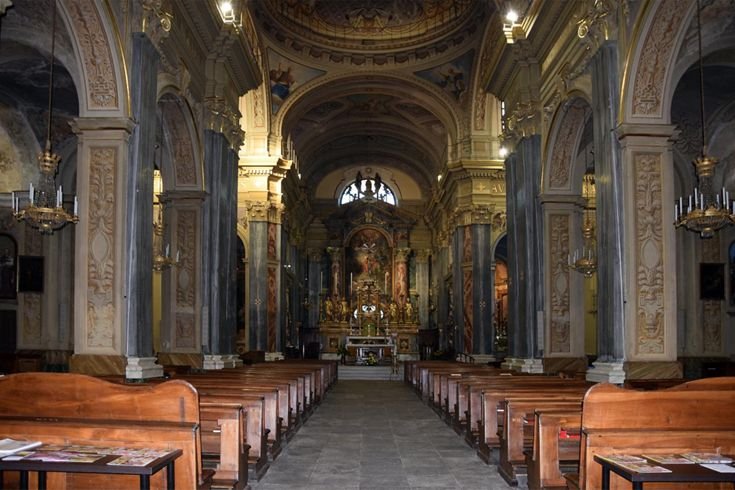 Restaurata nel 1472, la chiesa di San Dalmazzo divenne insufficiente per cui nel 1575 si decise la ricostruzione cambiando l’orientamento come lo vediamo oggi; il progetto ed i lavori vennero affidati a Marianno de Marianni di Lugano. Il nuovo edificio, terminato nel 1592, risultò a tre navate divise da otto colonne; di fronte si trovava il cimitero.