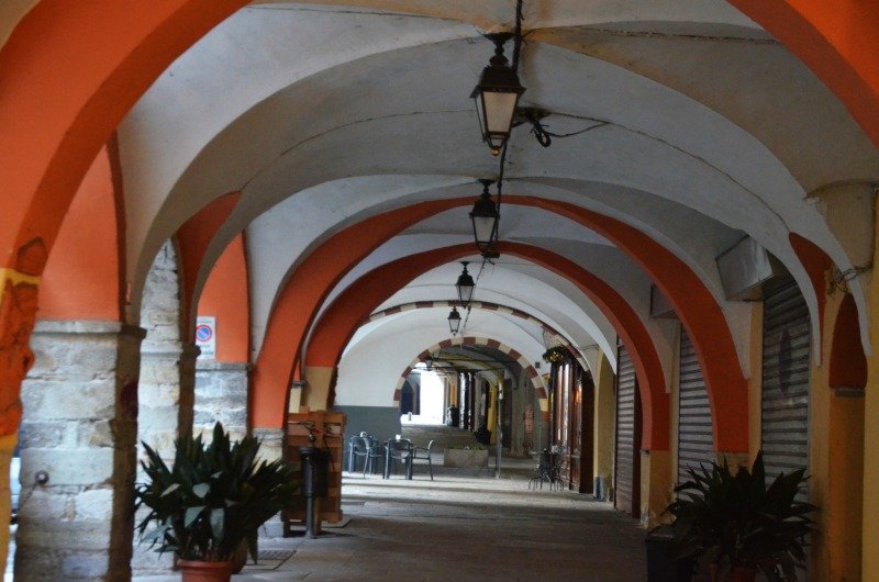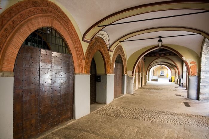 La via racchiude gli elementi più caratteristici del borgo di epoca medioevale. Ancora oggi rappresenta un significativo esempio urbanistico e architettonico di antico borgo mercantile: i negozi si affacciavano sul portico e altri negozietti erano posti fra pilastro e pilastro verso la via carraia, “banchi fissi” con magazzino sottostante il portico cui si accedeva da botole in parte ancora ben visibili.