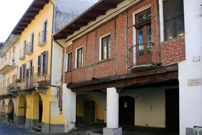 L’edificio al civico 11 ha un bel soffitto tutto in legno sostenuto da robuste travature poggianti su un grande trave maestro; si noti anche la colonna cilindrica con capitello in legno. Anche la facciata è di notevole interesse, ad un piano solo con struttura in travetti lignei tamponati in laterizio, tipologia costruttiva diffusa al Nord ma rara in Piemonte. È l’edificio più antico del Borgo: di qui si può arguire come inizialmente le case non siano state subito progettate con il portico, ma questo sia venuto solo in un secondo tempo, come semplice tettoia in legno per riparare la merce posta in vendita; poi sulla tettoia venne costruita una stanza, divenuta parte integrante dell’abitazione.