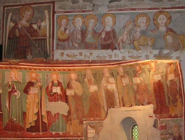 Sulla parete sinistra sono dipinti il Padre Eterno del 1300; san Michele che pesa due anime mentre il diavolo getta il forcone sulla bilancia; san Giulio che caccia i serpenti. Una Ultima Cena di prospettiva semplice ed intuitiva, probabilmente di fine XIV secolo o primo decennio del XV, attribuita al “pittore della Madonna di Re”.
