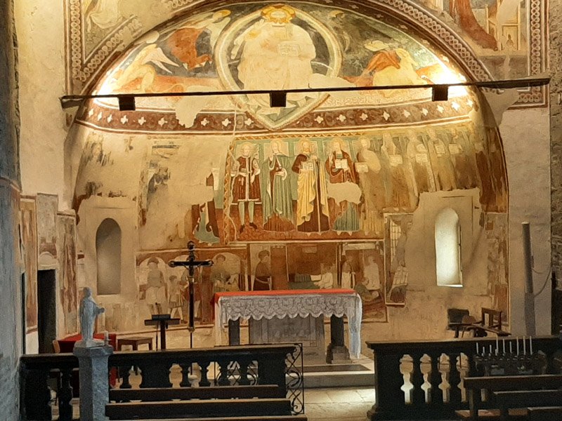 Nel catino absidale la consueta iconografia del Cristo in mandorla circondato dai simboli dei quattro Evangelisti; nel registro inferiore vi sono sette riquadri delle Opere di Misericordia, databili al 1400.