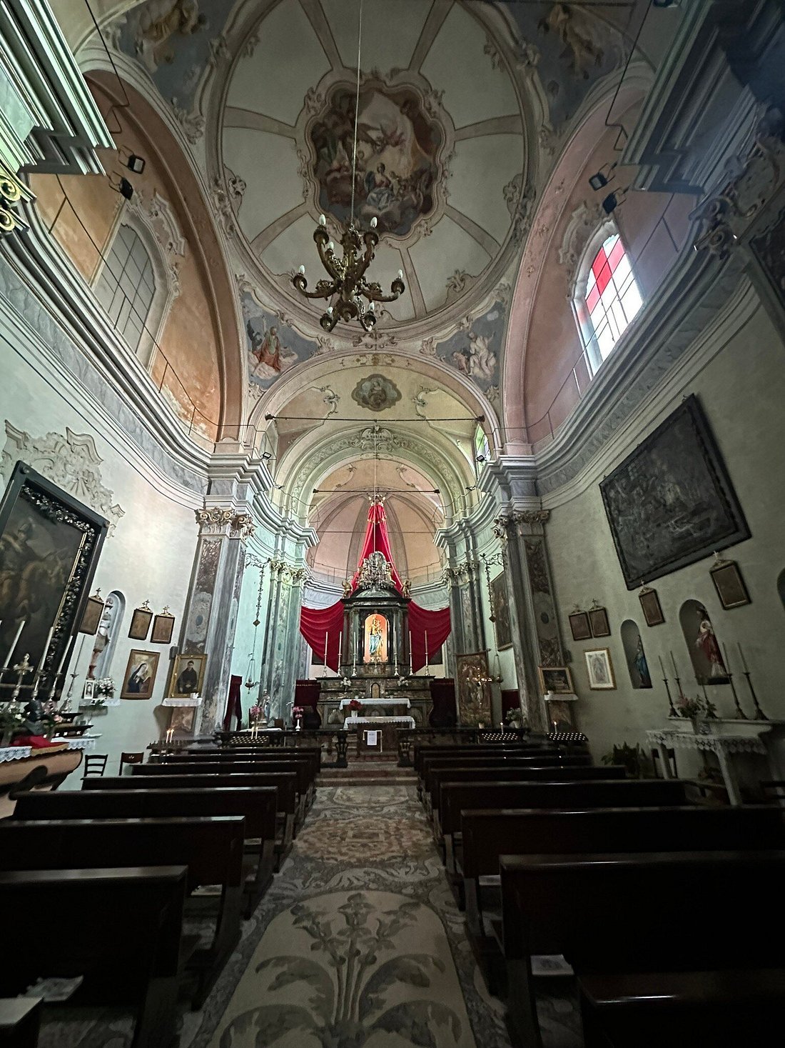 All’interno l’ambiente, rinnovato nel corso dell’Ottocento, ospita un pavimento in mosaico policromo realizzato nel 1880 e un coro ligneo scolpito verso il 1785 da Fortunato Uslengo, testimonianze dell’impegno della comunità parrocchiale nell’arricchimento degli spazi sacri.