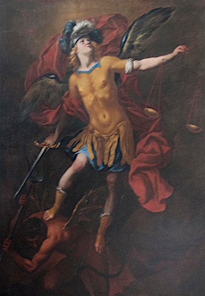 Il coro è rivestito da buone tavole di noce finemente intarsiato e sopra di esso al centro si ammira una grande tela settecentesca raffigurante il Patrono S. Michele in atto di debellare il nemico infernale: splendida è sotto ogni aspetto la cornice in marmo rosso e nero sormontata ai due lati da due angeli in marmo bianco. Nel medaglione centrale si legge la scritta: “Sancte Micrael Arcangele hic et ubique veni in auditorium populo Dei”