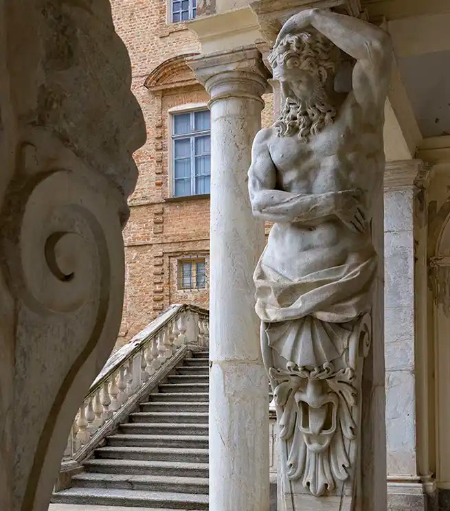La maestosa facciata, caratterizzata da uno scalone d’onore a quattro rampe e realizzata verso la fine del XVIII secolo, fu arricchita con le imponenti sculture seicentesche provenienti dalla smantellata Fontana di Ercole della Reggia di Venaria, con i telamoni di Giovanni Battista Casella e Carlo Pagano e con i quattro bozzetti dei Trofei militari in terracotta, progettati da Giovanni Baratta per Palazzo Madama, utilizzati per decorare la facciata di levante.