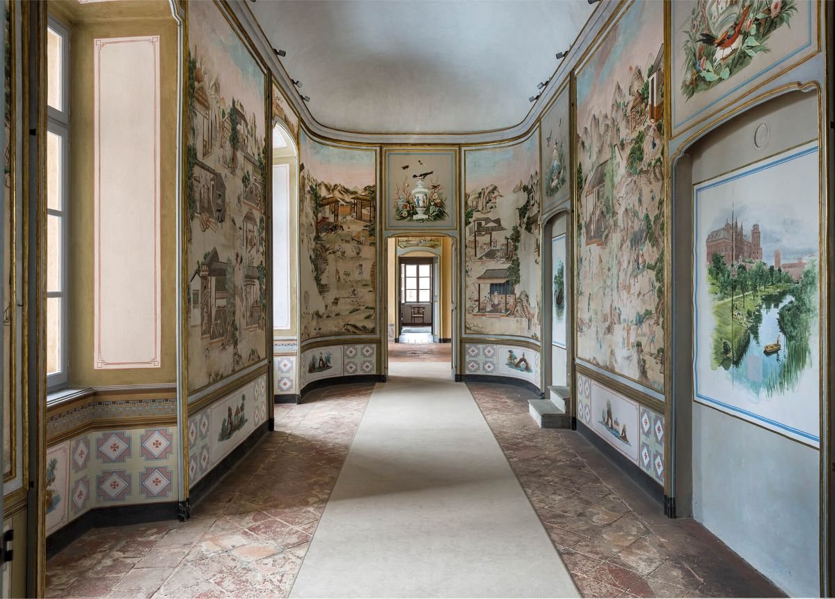 Acquisita dai Savoia alla fine del XVII secolo, il castello fu scelto da Carlo Felice come villeggiatura estiva. Gli interni furono decorati con affreschi e trompe-l’oeil di ispirazione mitologica come quelli che decorano il salone d’onore che riproducono il mito dei Niobidi presenti negli Uffizi di Firenze. Il gusto dell’esotico e la passione per la Cina caratterizzarono numerosi ambienti nelle residenze nobiliari dell’epoca; anche nel castello di Govone sono presenti negli “appartamenti delle principesse” preziose carte da parati cinesi rappresentanti i cicli di produzione di seta, tè, riso e porcellana e da ricche decorazioni floreali; ad oggi è la più grande estensione di decorazione in Italia.
