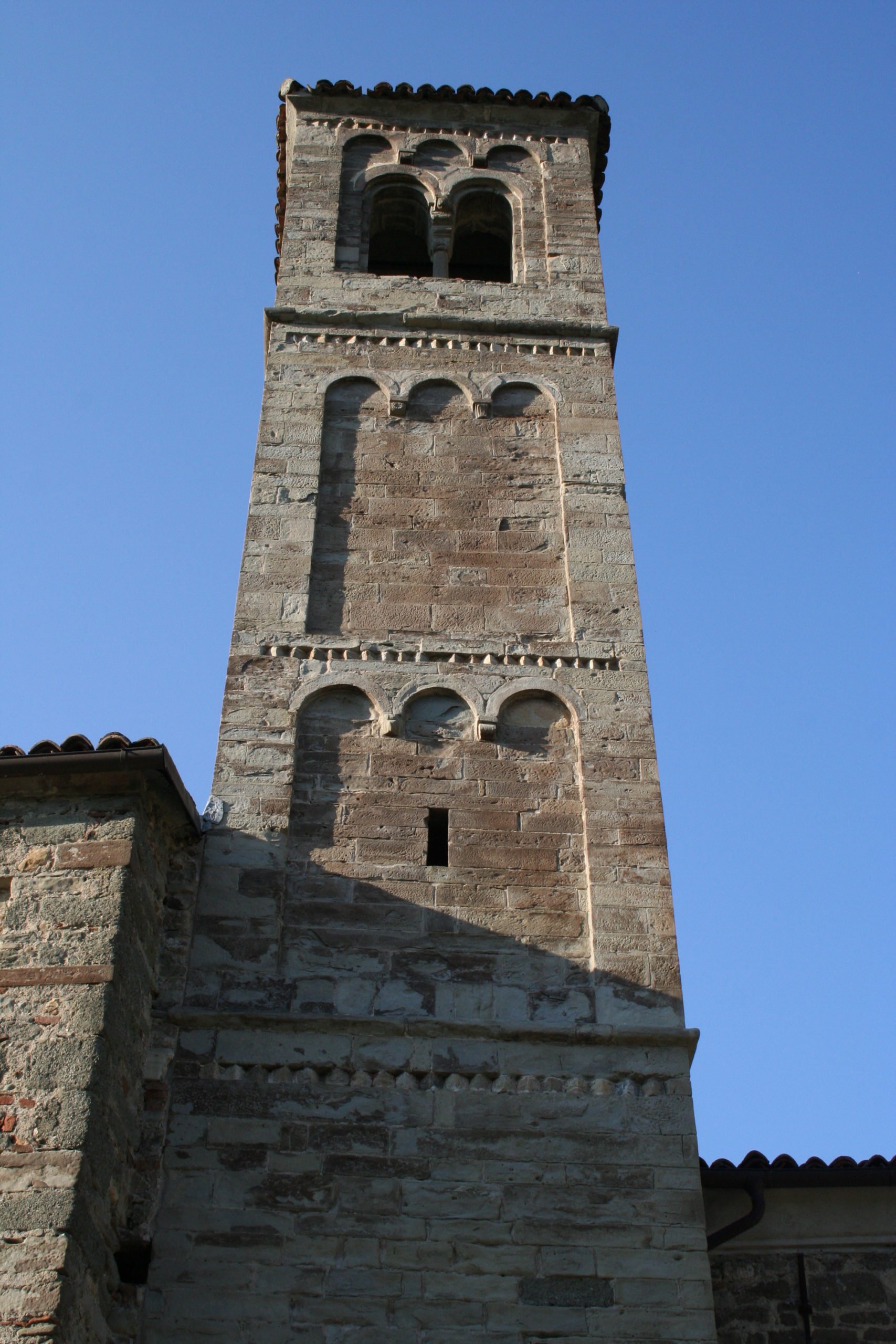 Il campanile romanico a pianta quadrata, in perfetto stato di conservazione, è formato da conci squadrati e si eleva per quattro piani segnati esternamente da cornici a denti di sega con specchiature ad archetti pensili ciechi. La cella campanaria è aperta da bifore con pilastrino concluso da capitello a stampella.