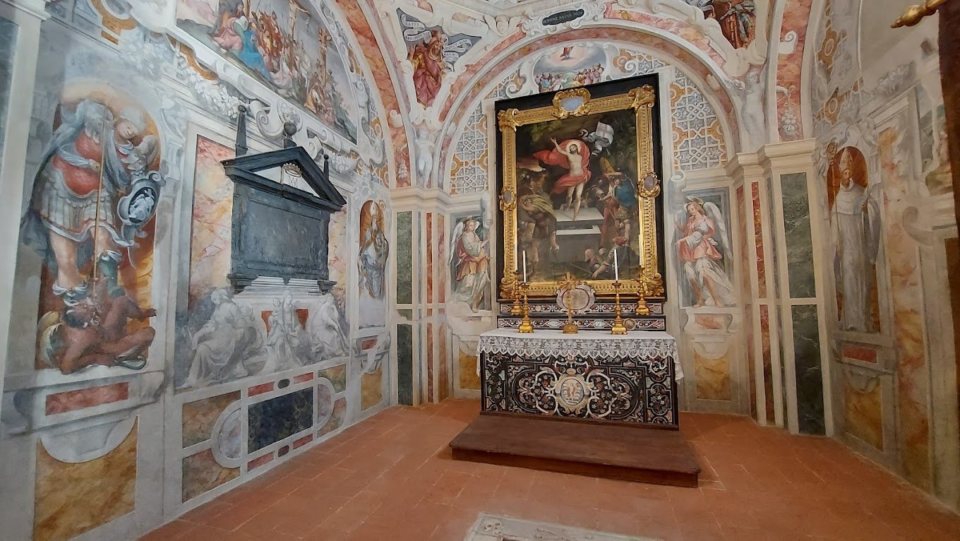 La decorazione, attribuita a Giovanni Angelo Dolce, è incentrata sulle Storie di Cristo che vengono narrate in medaglioni aperti sulle pareti e sulla volta, fino a terminare nella tela con il Cristo Risorto.