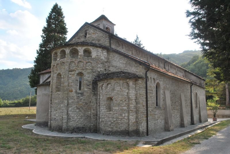 All’esterno, nella parte posteriore, spiccano tre corpi absidali perfettamente semicircolari (uno è stato completamente restaurato), realizzati con materiale lapideo di vario tipo e pezzatura, vale a dire pietre locali e ciottoli di derivazione fluviale. La loro decorazione è caratterizzata da file di archetti pensili su lesene che suddividono le superfici circolari delle absidi in diverse parti, al cui interno è presente una monofora per ognuna. L’abside centrale ha poi alla sommità una cornice di archetti pensili con fornici; il motivo degli archetti si ripete lungo i fianchi dell’edificio, nella parte alta.