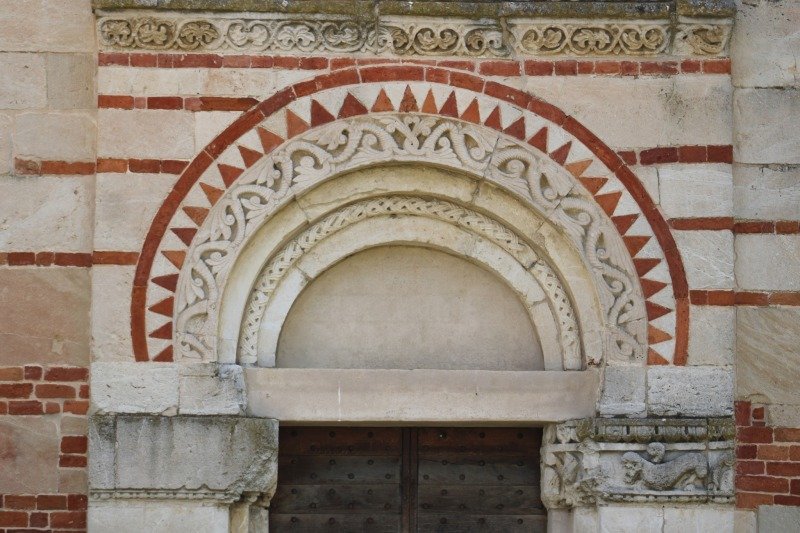 Il portale è sormontato da un arco a tutto sesto con una doppia ghiera: quella interna data da un motivo scolpito a cornucopia, quella esterna con un motivo bicolore a “denti di lupo”, ottenuto con l’alternarsi di tessere triangolari di pietra e di laterizio.