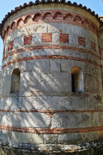 Anche nei fianchi e nell’abside si ritrova l’effetto cromatico delle fasce alternate di cotto e di arenaria.