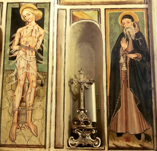 Sulle pareti laterali si trovano altre raffigurazioni: S. Antonio abate, S. Sebastiano, ma una in particolare, attrae l’attenzione: tra due Madonne con Bambino che sono negli atteggiamenti e nell’espressività quasi del tutto uguali, il beato Guglielmo Fenoglio certosino di Casotto.