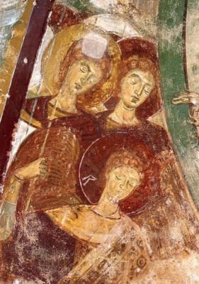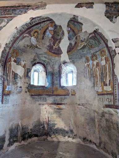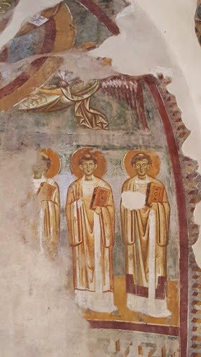 Nell’abside centrale vi è Cristo Pantocratore, e sulla sinistra, l’immagine di San Michele arcangelo che guida una schiera di angeli; nell’abside destra un altro Cristo Pantocratore in una mandorla sorretta da figure di angeli, e nel registro inferiore figure di Diaconi.