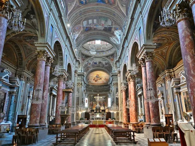 Interamente affrescata con Scene della vita di Maria, opera di Pietro Ivaldi detto il Muto (1810 – 1885). Le navate laterali sono formate da quattro campate ciascuna, quindi con otto cappelle o altari laterali, più i due altari ai lati del transetto.