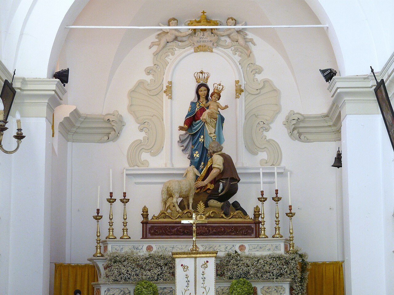 Dietro all’altare centrale è posta una statua dipinta con vivaci colori della Madonna col Bambino e ai suoi piedi un pastore inginocchiato e una pecora; alle spalle, in alto, un decoro a stucco con corona e due putti.