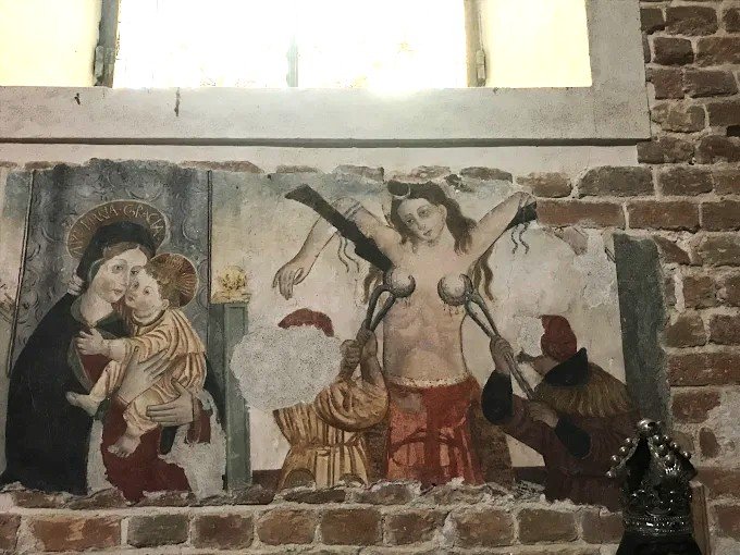 Altri frammenti d’affresco di diversa mano (ultimo quarto del secolo XV) si trovano sulla parete destra; furono in parte distrutti dall’apertura di finestre effettuata nel 1904: nella prima campata san Martino, martirio di sant’Agata, Madonna in trono col Bambino e una Santa non identificata, di altra mano.