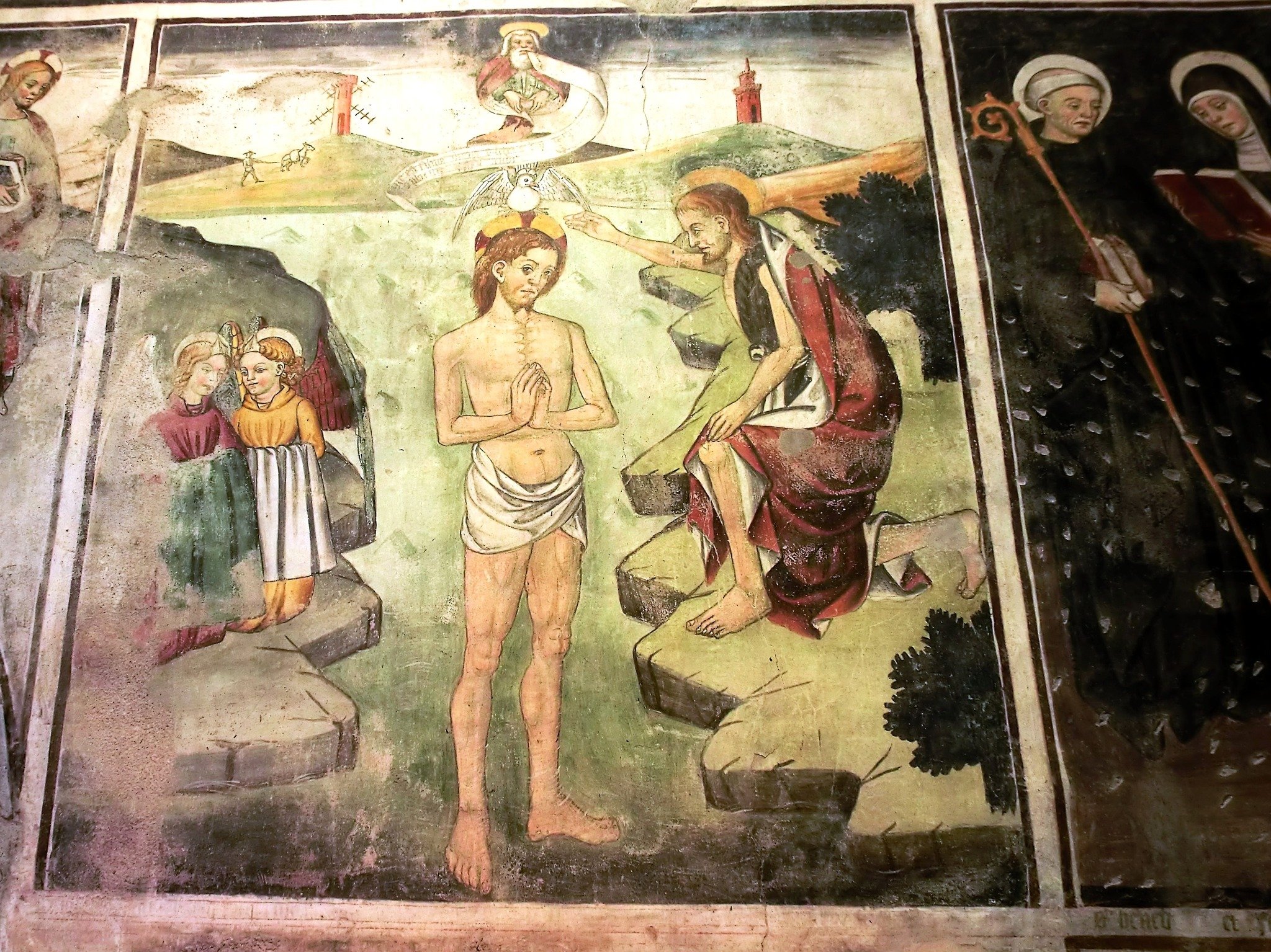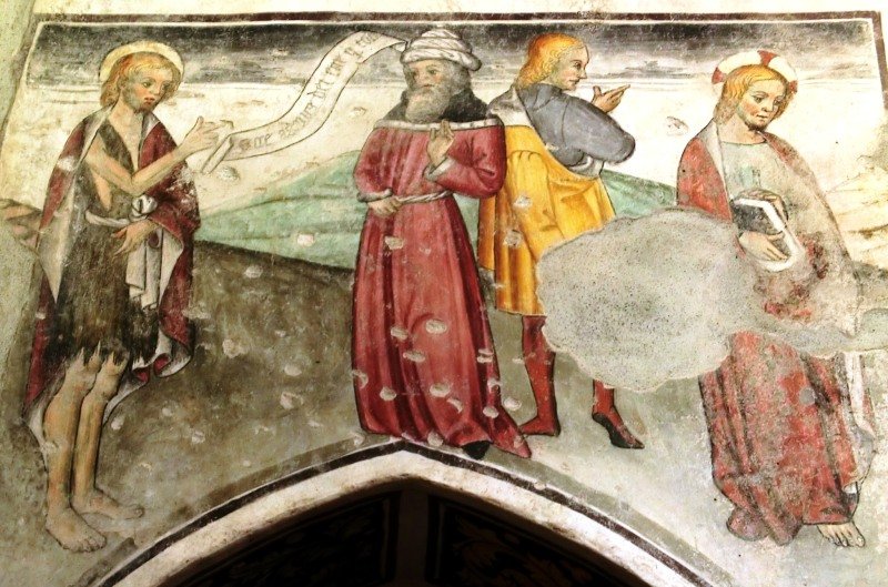 Sempre all’esterno della chiesa è caratteristico il piccolo affresco sulla navata destra, raffigurante una Crocifissione, ancora di gusto medievale.