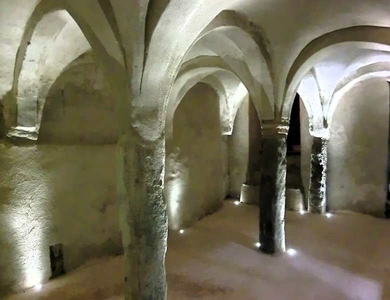 Particolarmente affascinante la piccola cripta, di spoglia e campestre semplicità, compatta ma anche vagamente leggiadra nella sua ingenua struttura architettonica caratterizzata da colonne in pietra appena squadrata. Sono colonnine monolitiche, molto rozze e simili a quelle della cripta di Borgo San Dalmazzo, anch’essa un tempo monastero benedettino.