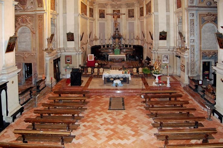 L’interno è caratterizzato da una navata unica con volta a botte, sulla quale si aprono due cappelle e due tribune per lato. Nel 1742 furono finite le decorazioni a stucco e ad affresco dell’interno, fra cui episodi della vita di San Remigio, patrono del paese, e di altri santi posti sotto il cornicione marcapiano. Sopra di esso, sorretto da lesene e riccamente modanato, si aprono otto finestre ornate da stucchi.