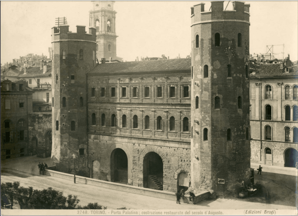 Nel 1934 avvenne la sistemazione del complesso monumentale, furono abbattuti alcuni edifici fronteggianti per creare un piazzale dove collocare le statue di Cesare e di Augusto, tradizionali fondatori di Augusta Taurinorum, copie bronzee di antiche sculture; entrambe le torri vennero coperte con solette di cemento armato, in modo che fossero impermeabili all’acqua.
