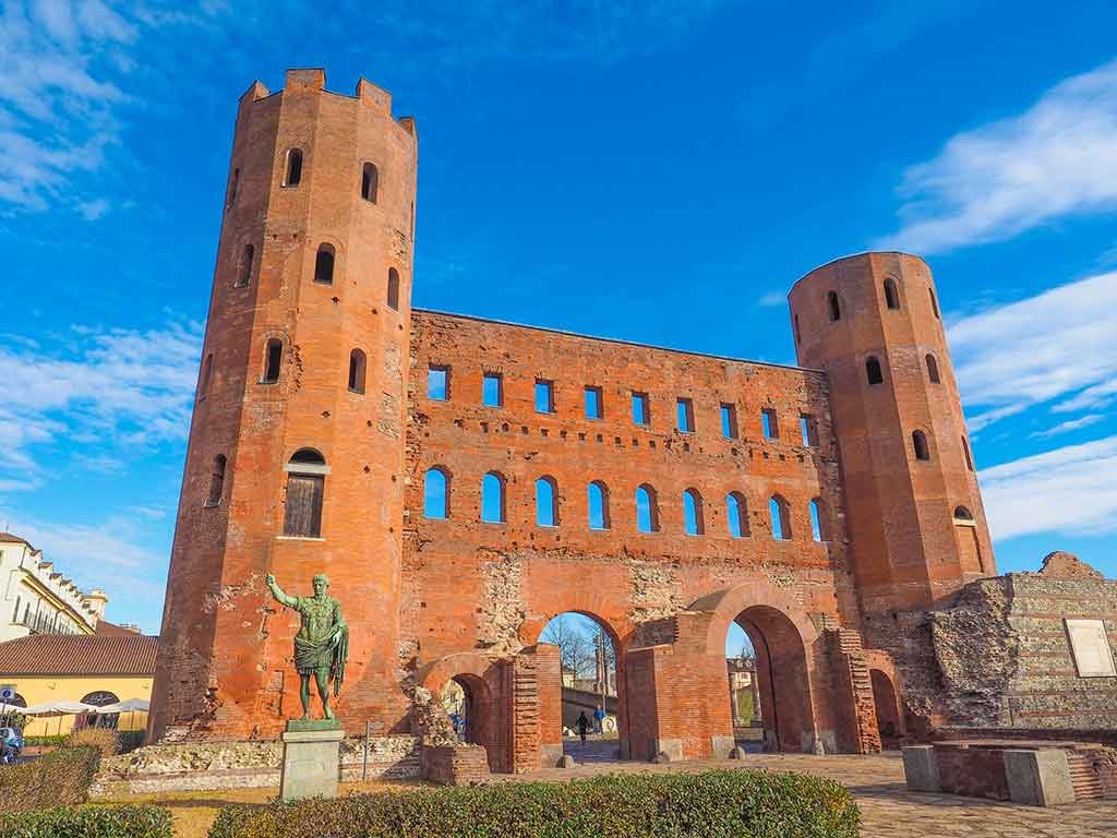 La Porta Palatina è l’antica Porta Principalis Dextera che consentiva l’accesso da settentrione alla Iulia Augusta Taurinorum, la civitas romana oggi nota come Torino. Alle spalle della facciata, verso la città, vi era la statio per il corpo di guardia; di pianta rettangolare, circa 20,50 x 16,80 m, che aveva anche di due piani superiori corrispondenti ai due ordini di finestre dell’interturrio. L’altezza della struttura viene indicata in 18,30 m. Le torri della porta Palatina dovevano avere una struttura interna simile a quelle della Porta Decumana in Palazzo Madama , e misurare 7,20 m di diametro esterno e 5,60 di quello interno, mentre lo spessore del muro era di 1,50 m.