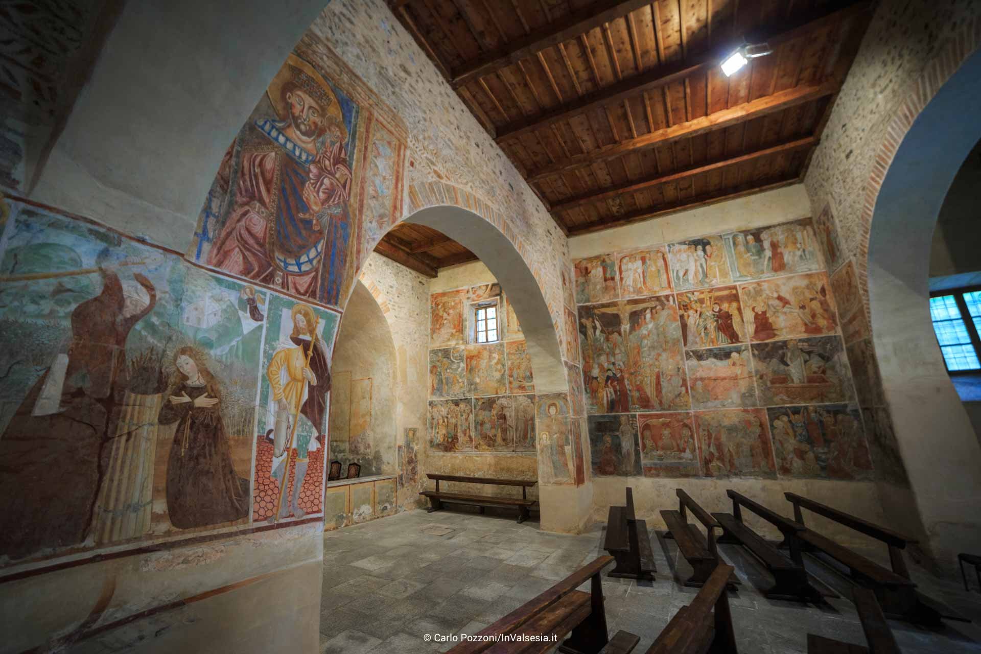 Altri affreschi, qualitativamente minori, risalgono alla fine del 400 e del ‘500. Al centro dell’altare in fondo alla navata di sinistra è stato ricostruito il battistero ad immersione; al secondo altare Madonna col Bambino attribuita al Cagnola (morto nel 1509). Nella cappella a sinistra, una Deposizione lignea della metà del ‘400 di artista valsesiano.